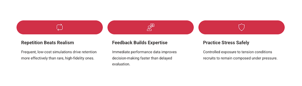 Repetition beats realism. Frequent, low-cost simulations drive retention more effectively than rare, high-fidelity ones.